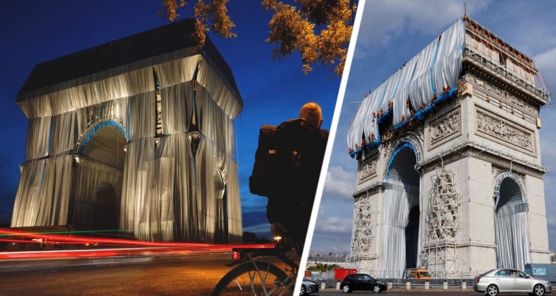 Триумфальная арка является одним из самых известных памятников Парижа и ежегодно привлекает огромное количество туристов. Однако на этот раз посетители оказались в замешательстве, увидев, что знаменитая достопримечательность завернута в серебристо-голубую полипропиленовую ткань, пригодную для вторичной переработки, в качестве посмертной инсталляции. Как выяснилось, идея создания данного шедевра принадлежала покойному художнику и скульптору Кристо Явашеву.