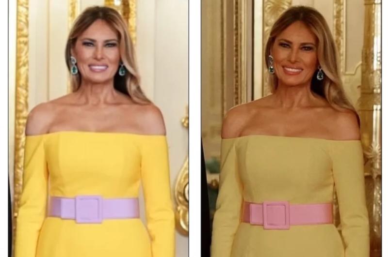 Модные наблюдатели озадачены платьем и ремнем Мелании Трамп, которые первая леди США надела на ужин с королевской четой в Великобритании, комбинация создала оптическую иллюзию, пишет Daily Mail.